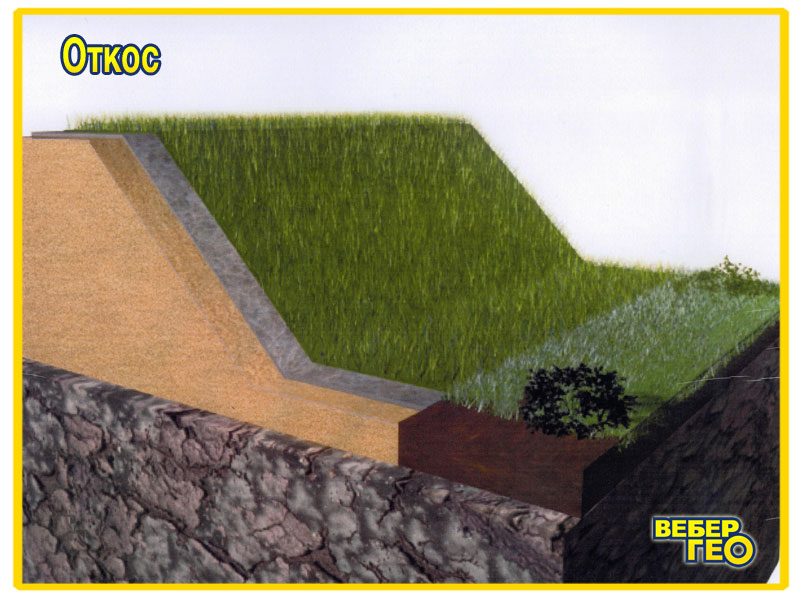 - Как антиэрозийное покрытие откосов водоотводных сооружений или откосов насыпей.